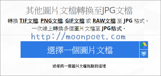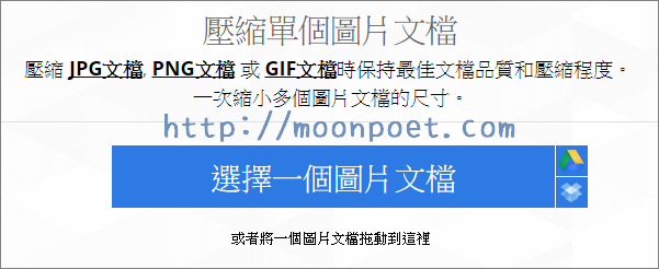 ▼ 首先先介紹壓縮圖片功能,我們只需點擊藍色按鈕或是直接把圖檔拖曳到網頁畫面中就能上傳檔案。