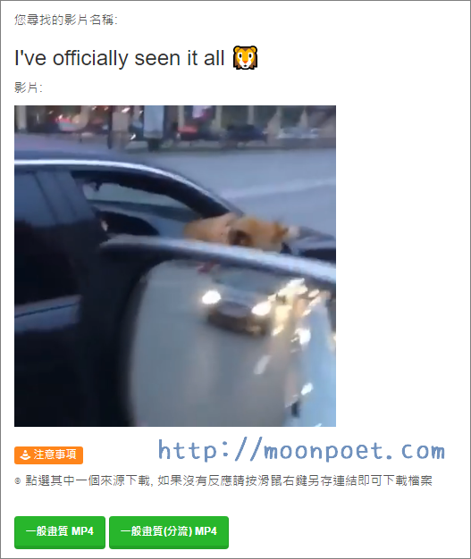 ▼ 接著就會進入這個畫面,告訴您已經抓出連結,您能直接點擊下方的兩個綠色按鈕其中一個進行下載。
