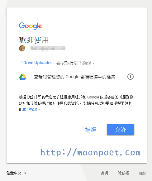 ▼ 因為 Drive Uploader 會向您的帳號索取 Google Drive 的存取權,如果您ok的話就按下允許吧。
