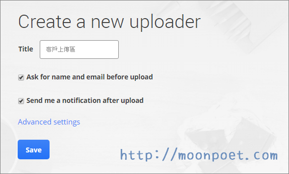 相信大家都有當活動發起人或是報告整理人的經驗,有時我們需要跟同事、朋友索取他們負責部份的檔案,但因為E-mail有附件大小的限制,導致有時要傳檔是件很麻煩的事,所以小編今天要介紹一款非常便利的服務「Drive Uploader」,它能將我們的 Google Drive 變成一個公用的上傳平台,只要分享我們建立好的上傳平台網址,就能讓許多人自行上傳檔案到您的 Google Drive 雲端硬碟中,非常方便。