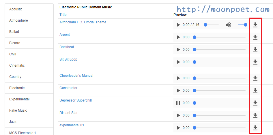 免費音樂素材庫 FREEPD 各種曲風隨您下載使用 文章作者:菲爾 文章類別:免費資源 / 影音素材 文章評論:0 則留言 網路與攝影設備發展神速,許多人都喜歡拍攝影片上傳與大家分享,而影片若沒有適合的配樂陪襯好像會覺得乾乾的,今天要介紹一個不錯的免費音樂素材網站「FREEPD」,它提供各種不同曲風的配樂,像是鄉村、電子、流行、爵士等,都很適合用在影片的配樂,重點是這裡提供的音樂都是免費取用的,如果喜歡,也能付錢一次把全部都打包(755首),算是給作者的支持。 FreePD 免費音樂素材:請點我 ▼ 進入網站後您能在左方看到各種曲風的分類選單,隨您喜歡自由點入。 ▼ 您可以在網頁上直接預覽收聽,覺得不錯就能按後面的下載鍵進行下載。 標籤: 免費音效庫, 免費音樂下載網站, 免費音樂素材下載 閱讀更多文章 上一篇文章線上聽音樂網頁 Listen Video 能看MV也能聽歌 您可能也感到興趣的內容 Drive Uploader 讓 Google Drive 變身免註冊免費上傳空間 停電查詢及通報網址 避免手機號碼外流減少詐騙電話 TempSMSS 簡訊代收服務網站 發表迴響取消回覆