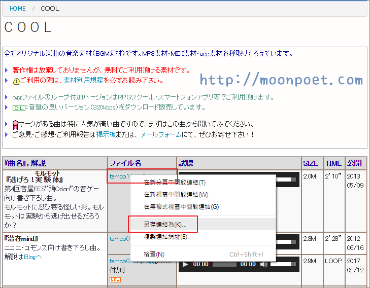 TAM Music Factory 日系免費音效素材下載 文章作者:菲爾 文章類別:免費資源 / 音效素材 文章評論:0 則留言 當我們製作影片時,最需要的就是找首好聽的配樂來搭配,才能使影片不會那麼乾,這裡介紹一個非常不錯的日本配樂素材網「TAM Music Factory」,它提供各種風格的日系音樂、音效,讓我們能自由使用在非商業用途中。 TAM Music Factory:請點我 ▼ 左手邊能看到音效的類型,您可以自由選擇喜歡的類型。 ▼ 每一首都能先進行試聽再決定要不要下載。 ▼ 如果喜歡就能在mp3的鏈結上點擊右鍵,選擇另存連結。 P.S. 所有素材能免費使用於個人與非商業用途,若要使用於商業用途請參考素材利用規定所述。 標籤: MP3下載, 免費配樂, 免費音效, 免費音樂, 免費音樂下載, 免費音訊, 原創音樂, 日本, 熱門主題, 素材, 網路資源, 背景音樂, 設計, 遊戲, 遊戲製作, 遊戲設計, 遊戲音效, 錄音, 音樂下載, 音樂搜尋, 音樂素材, 音樂電台, 音樂音效 閱讀更多文章 上一篇文章illust AC 免費向量圖庫素材下載 日系可愛圖示 下一篇文章線上文字轉語音下載mp3 支援男聲女聲 Notevibes 您可能也感到興趣的內容 線上聽音樂網頁 Listen Video 能看MV也能聽歌 網路繳費服務平台網站 e-Bill 全國繳費網 想成為復仇者聯盟的一員嗎? 其實只要一張照片就可以 發表迴響取消回覆