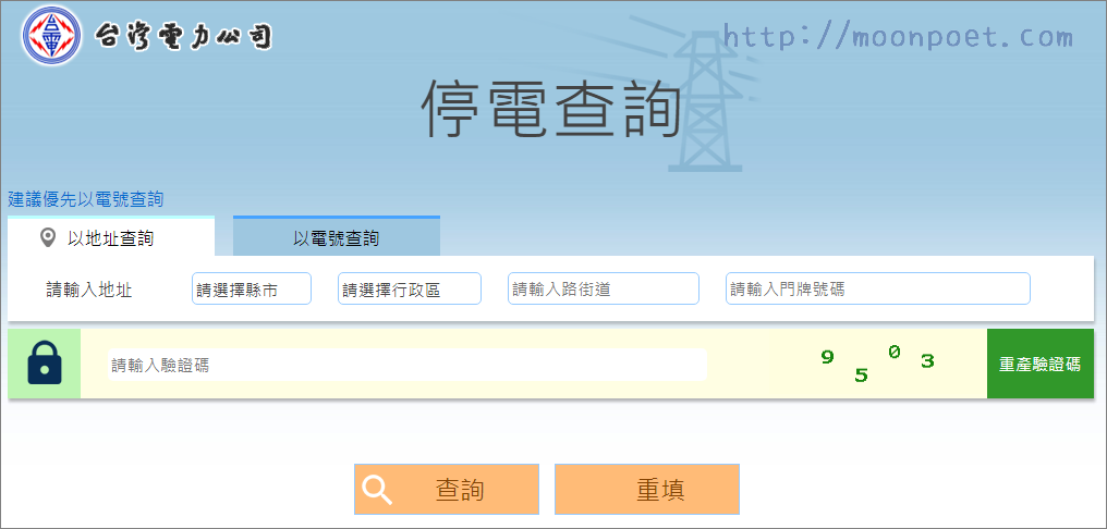 ▼ 選擇停電查詢就能進入查詢系統,這裡有兩種方式能進行查詢,一個是地址,另一個則是電費帳單上的電號。