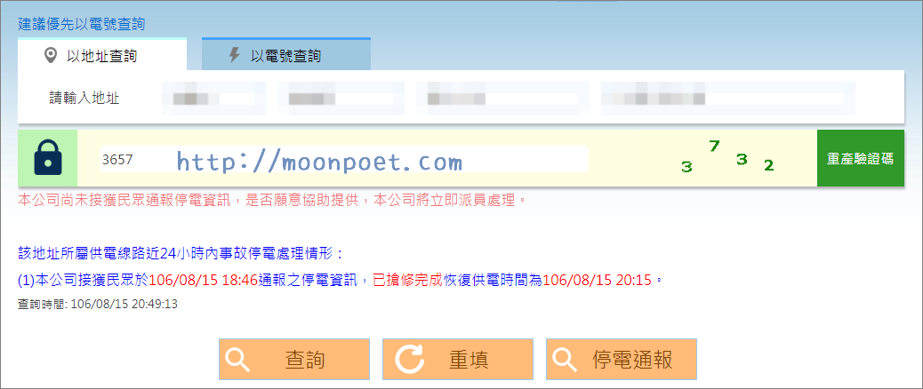 ▼ 我們先依序選擇縣市、行政區、輸入路街道名、再輸入門牌號碼,最後再輸入驗證碼,點擊查詢就能查出您的地址是否有停電,查詢結果會告訴您何時接獲停電通報,何時完成搶修,如果還沒修好您可以再點擊停電通報進行報修。