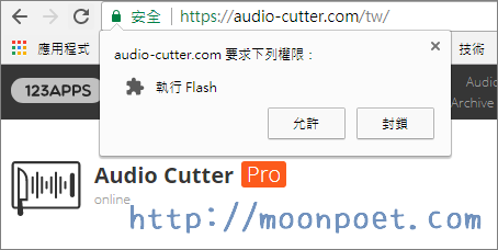 ▼ 我們先試試音樂剪輯工具,因為服務是用flash技術在運行的,而各瀏覽器也都開始將flash列入容易使人中毒的技術,所以都不主動支援,或是必須另外開啟,小編用Chrome開啟網站就必須另外在提示區域按一下才能啟用,如果不放心的人就放棄吧。
