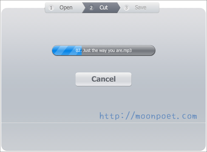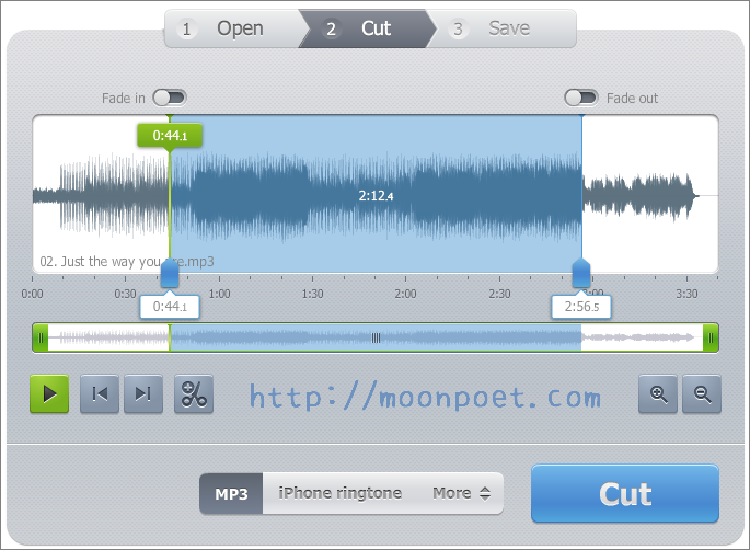 ▼ 開啟後就會出現這樣的編輯畫面,您可以任意調整要剪輯的區段,而上方的Fade in與Fade out則是淡入淡出的效果,可自由開啟,綠三角就是試聽鍵囉,剪完就點擊Cut進行修剪。