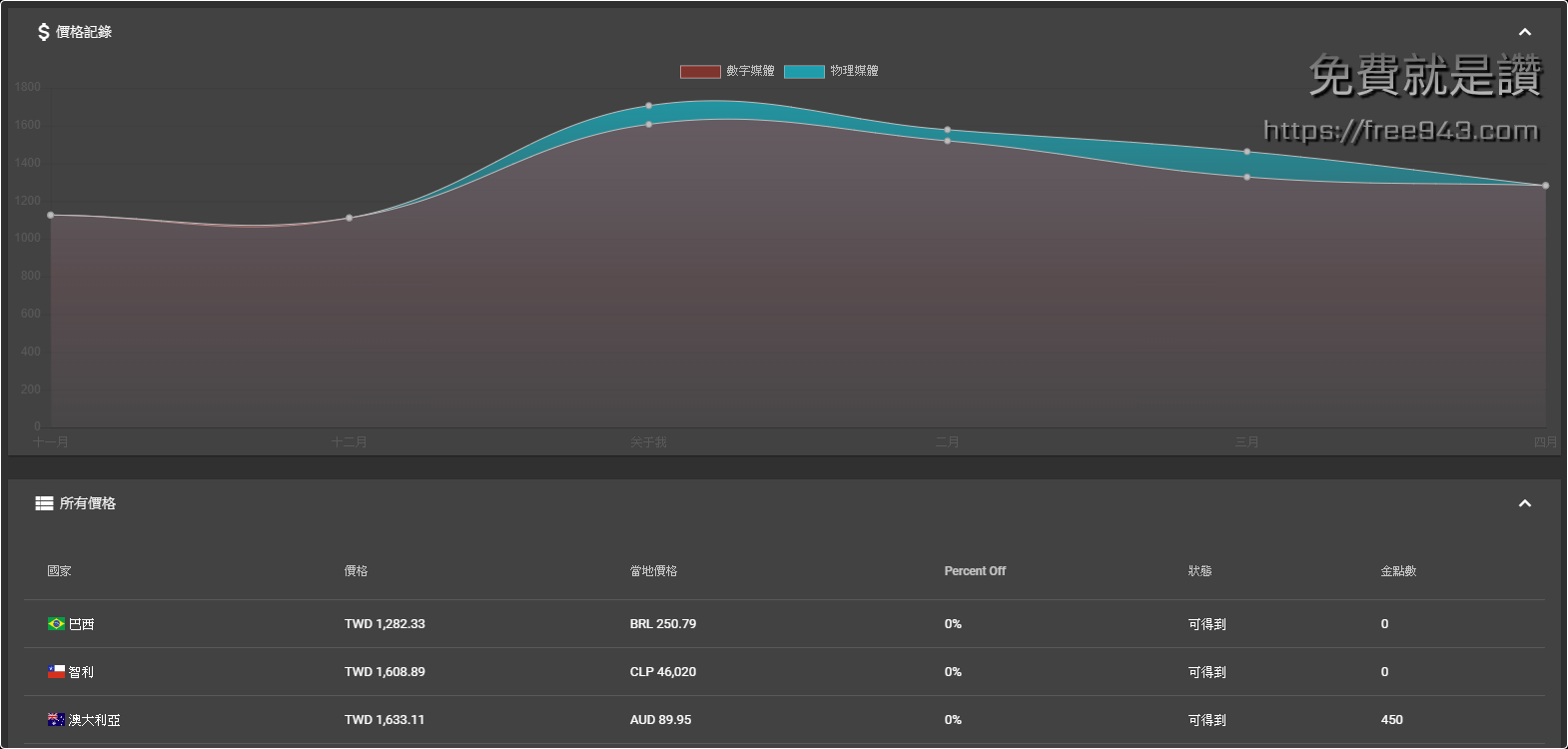 ▼ 往下拉還能看到整個價格的歷史走勢,數字媒體(數位版)、物理媒體(實體版),下方則會以國別來排列價格高低。