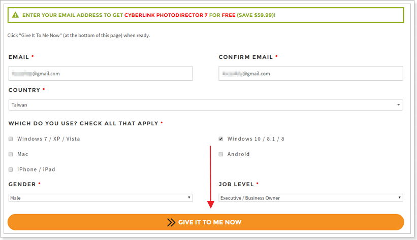 ▼ 請填寫相關資料,有紅色星號表示必填,主要的就是E-mail,填寫完成後點擊橘色按鈕。