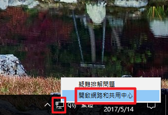 ▼ 右下狀態列中的網路連線圖示按右鍵,選擇開啟網路與共用中心。