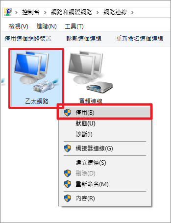 ▼ 在您使用的網路連線上按下右鍵,選擇停用。