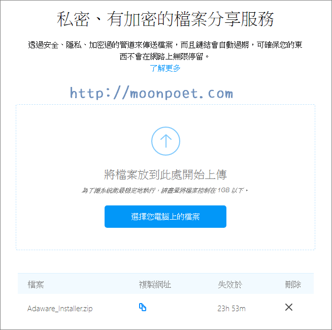 ▼ 進入上面網址後您可以直接點擊選擇您電腦上的檔案的按鈕,選擇您要上傳的檔案後會自動上傳,完成後就會出現下方的畫面,只要複製網址給朋友就搞定了。