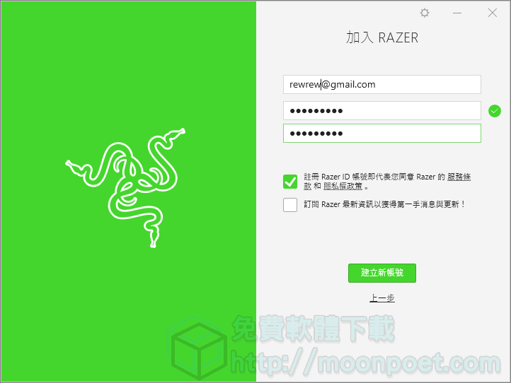 ▼ 輸入您的Mail與密碼兩次,勾選第一項後點擊建立新帳號註冊。