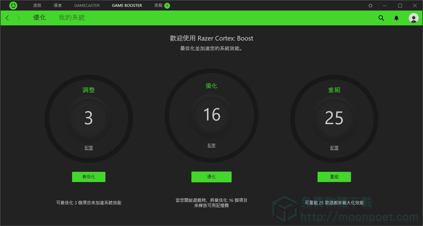 現今遊戲要求的硬體規格越來越高檔,主要也是因為畫質越來越高,但有些人在使用高配備玩遊戲時總是會覺得頓頓的,其實並不是硬體不好,而是您的系統沒有調校好,我們能使用這款由知名的電競硬體商所推出的 Razer Cortex 遊戲加速器來幫我們的電腦一鍵優化,快速又方便就能幫我們的遊戲優化整體系統,讓我們玩遊戲能更快且少掉那些卡頓感。