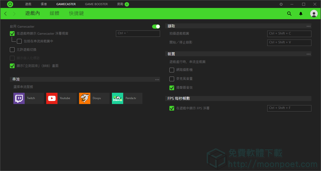 ▼ 另外一個頁籤GAMECASTER中提供非常多的功能,包括遊戲中擷圖、錄影、實況等,都能透過 Razer Cortex 在遊戲過程中完成。