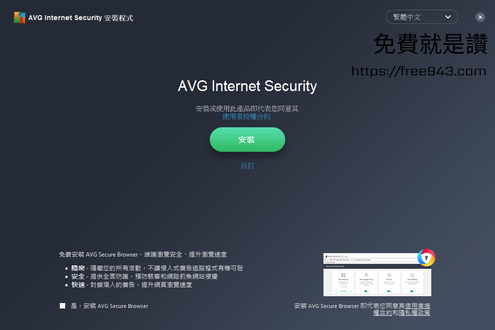 ▼ 接著就開始安裝我們的AVG網路安全套件,請點我下載,下載完成後請執行安裝,在安裝過程中左下角的安裝AVG瀏覽器可以取消勾選。