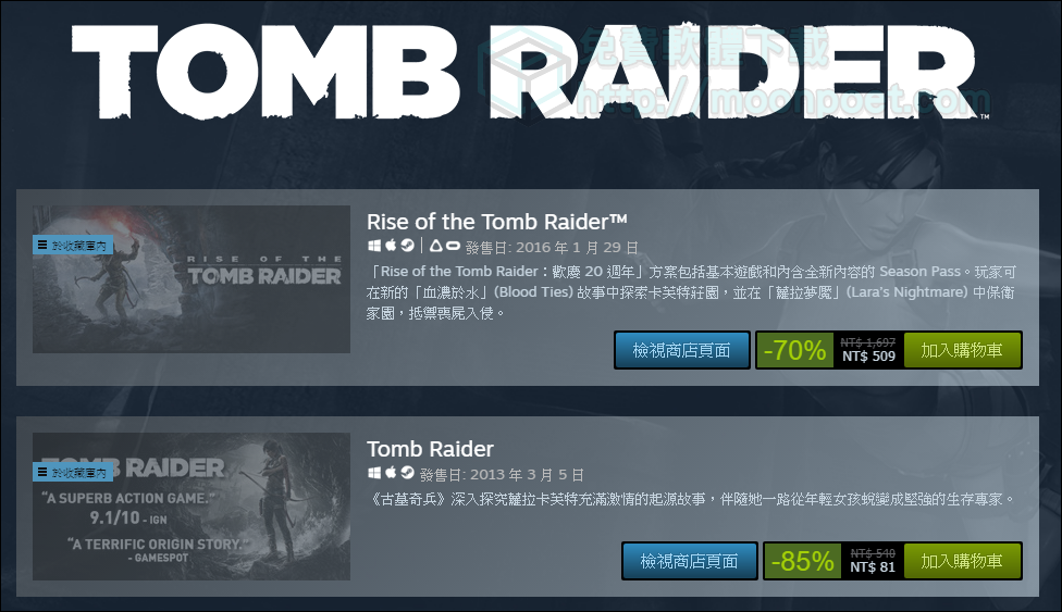 ▼ 古墓奇兵是許多動作遊戲迷們的回憶,重啟的古墓奇兵系列更是讓人愛不釋手,主要是因為超棒畫質與引人入迷的解謎要素(蘿拉的ㄋㄟㄋㄟ很讚),絕對是動作冒險愛好者必收的遊戲之一,當然,重啟後的第二代總算是大降價到509元就能入手,一代更佛心只要81元,但二代的系統的玩法絕對是誠意滿滿,列入必收遊戲真的不是很意外。