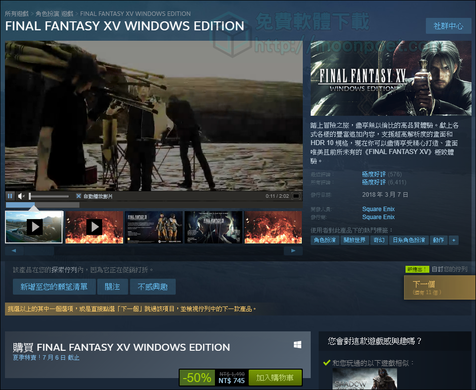 ▼ 最終幻想15,也是大家以前俗稱的太空戰士,第一代從任天堂紅白機到現在的PS4,可以說是非常長壽的一款RPG遊戲,但自從主機的效能不斷的進化後,遊戲也從一般的2D RPG進化到全3D的動作RPG,而且居然在電腦上推出了,只要745元,不收嗎?