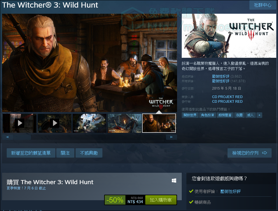 ▼ 巫師3,嚴格來說應該翻獵魔士才對,因為裡面的主角根本不是巫師啊…XD 這款波蘭公司的神作,沒玩過的朋友可以先到水管上看看遊戲的實際遊玩影片就會知道為什麼小編會說它是神作了,美到翻的畫面,與變種人白狼傑洛特到處接案解決妖魔大小問題的狩魔獵人,說它是動作RPG的第一名相信沒幾個人能反駁吧,夏特419元就能購入含DLC的年度版囉。