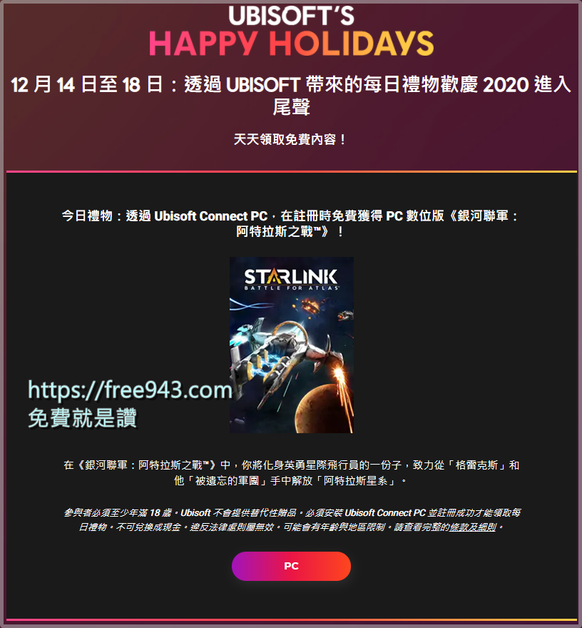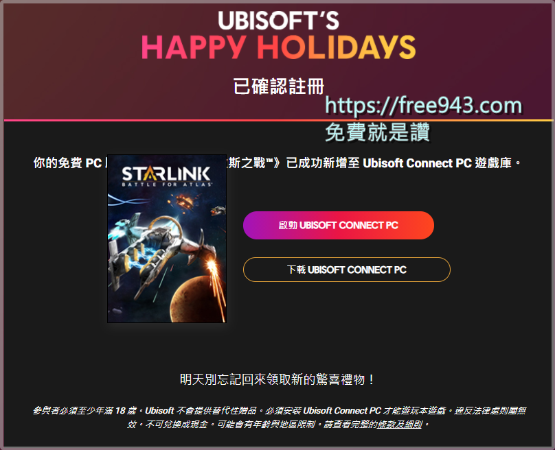 我老大Ubisoft又開始放送遊戲啦,這次是Happy Holidays的活動,12/14~12/18都有不同的好康等著大家領取,今天所提供的是銀河聯軍:阿特拉斯之戰 (Starlink: Battle for Atlas),雖然小編也沒玩過這類型的遊戲,但絕對是要先領起來放的。