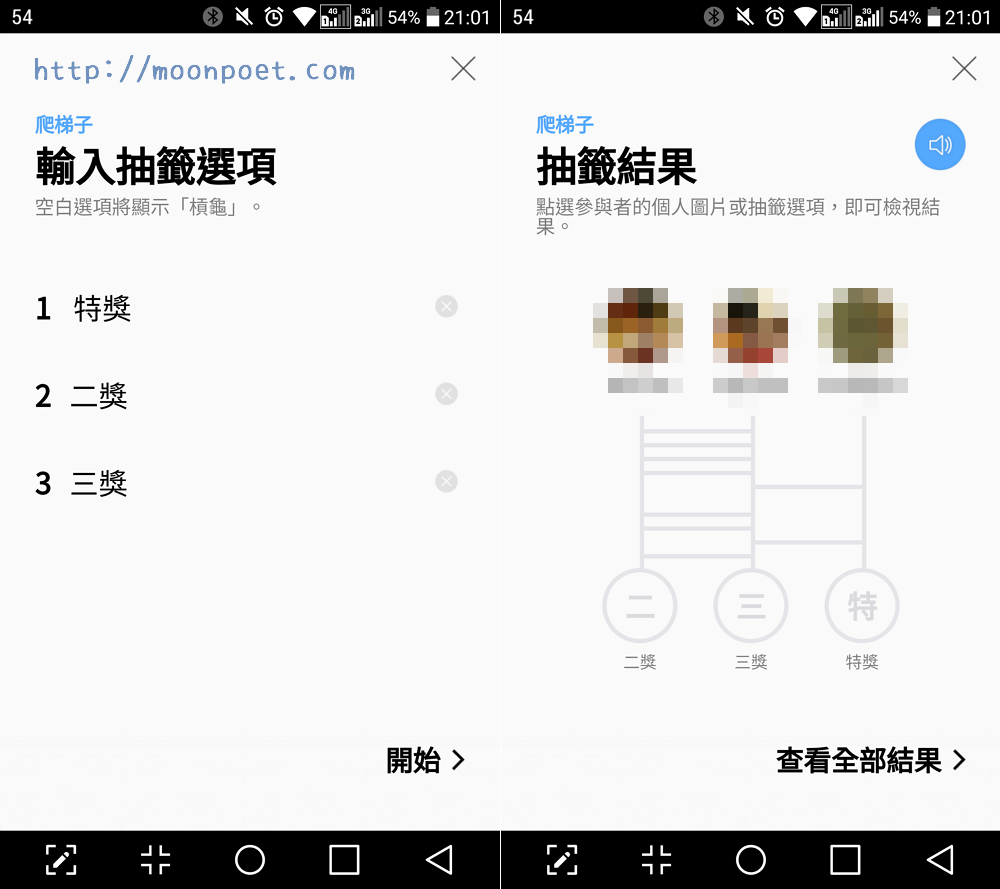 ▼ 只有三個人的話就只能做三個選項,輸入完成後點擊開始就會顯示抽籤結果,您可以直接在下方的結果點一下,就會知道誰得到什麼選項。