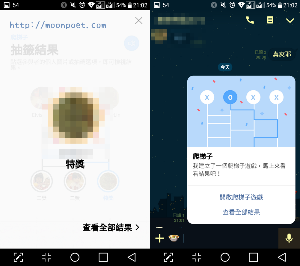 ▼ 當然您在產生爬梯子的結果時,同時也會將結果發佈給聊天室裡的朋友觀看,像要旅行時,用來分配每個人的工作真的很方便。
