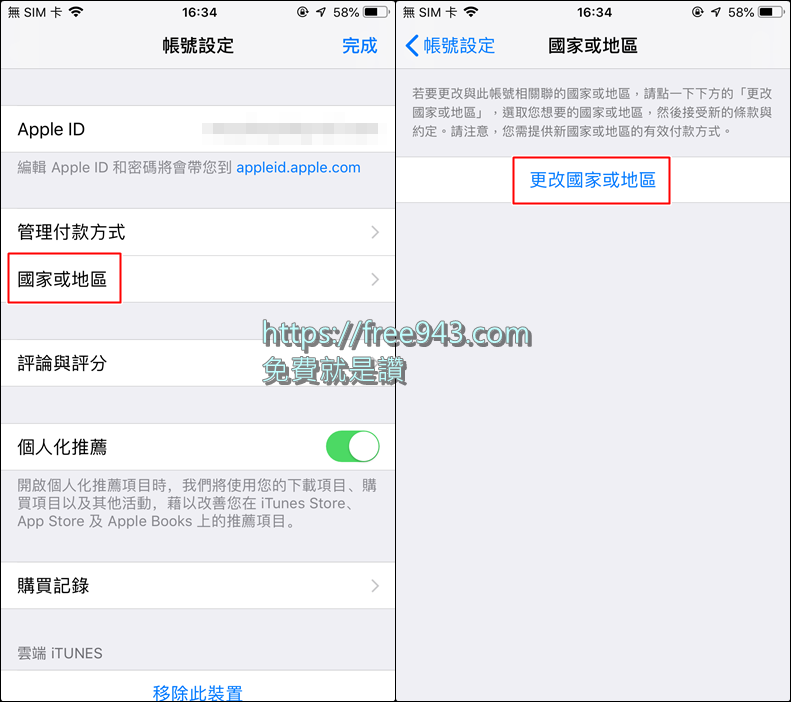 ▼ 進入帳號設定後再點擊「國家或地區」,最後再點擊「更改國家或地區」。