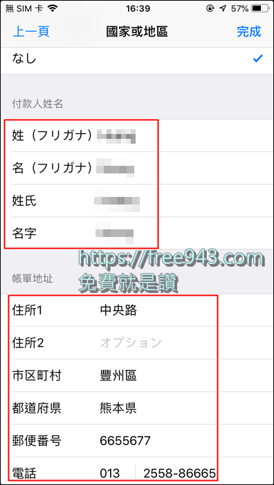 ▼ 這裡請選擇「なし」,這裡就會要您輸入付款人姓名與地址、電話相關資訊,您可以參考下圖,姓名共四欄,姓要與姓氏同,名要與名字同。其他大概不會有什麼問題,當這一步完成後,您就可以到 App Store 中搜尋並下載您想玩的日本遊戲了。另外一提,在您下載完成後您可以再切換回台灣的國別,一樣能使用下載的遊戲與 App 唷。