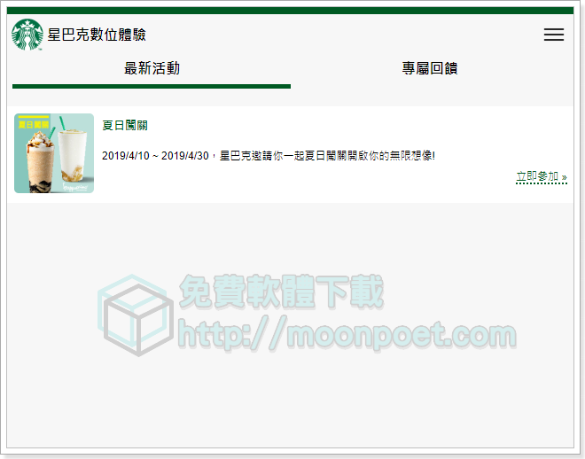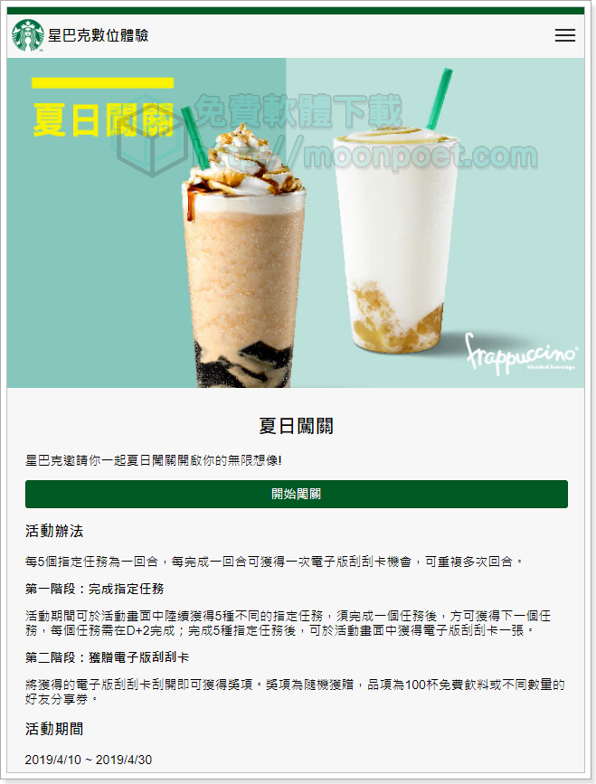 最愛買一送一的星巴克又有新活動了,只要透過星巴克的數位體驗網頁,陸續完成它給的任務共五次後,就能在活動畫面中取得一張電子刮刮卡,最大獎項有100杯免費飲料或是不同數量的好友分享券(買一送一券),喜歡喝星巴克的朋友可別錯過了。